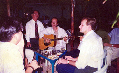 – Lâu rồi. Khi ấy, tôi còn ở Tây Nguyên, làm phiên dịch cho một công ty cà phê của Đức đặt văn phòng ở Ban Mê Thuột. Tôi nghe nhạc anh Sơn và thấy mê. Nhạc anh Sơn rất đặc biệt. Anh có để ý không? Bài nào cũng chỉ phất phơ có mấy nét thôi, cứ như là nhạc của trẻ con ấy. Nhưng nghe là nhớ ngay. Trịnh Công Sơn đã đạt được đến độ cao nhất của nghệ thuật. Đó là sự giản dị. Tôi yêu nhạc anh Sơn, rồi tìm đến thăm anh ấy. Thế rồi anh em biết nhau. Đơn giản thế thôi mà…